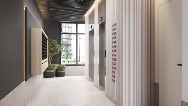 Элегантный холл первого этажа выполняем по авторскому, специально разработанному дизайн-проекту. В отделке используем современные, качественные материалы: металл, камень, керамику и стекло. Применяем окна с повышенными звуко- и теплоизоляционными показателями. На первом и типовых этажах дизайн-проектом предусмотрены элементы навигации и декоративные светильники. Ниши инженерных коммуникаций скрыты за декоративными задвижками и решетками.